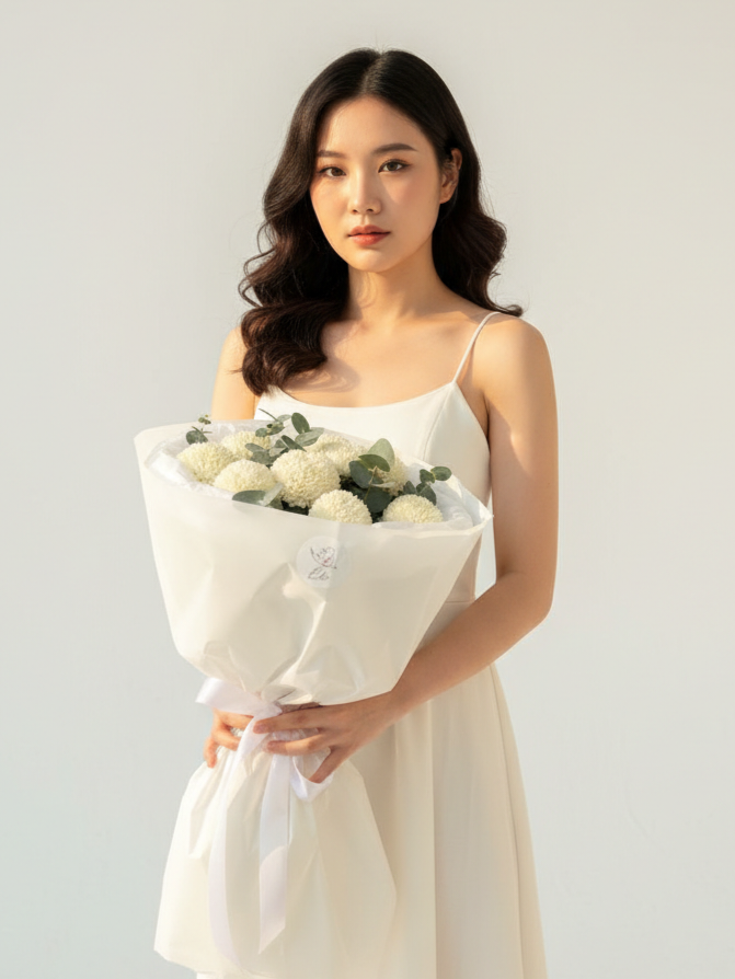 A bouquet of nine white Momoko chrysanthemums is a stylish and modern gift idea with a lighthearted feel. This variety is prized for its large, spherical blooms, neat shape, and pure white hue, which creates a fresh and minimalist look.