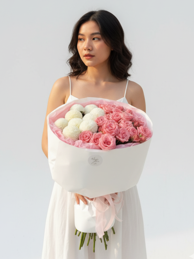 Букет из белых хризантем Momoko и розовых кустовых роз — это изящное и модное сочетание цветов в нежной цветовой гамме. Крупные белые бутоны придают объем и структуру, а розовые кустовые розы добавляют легкости и романтики.